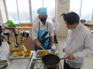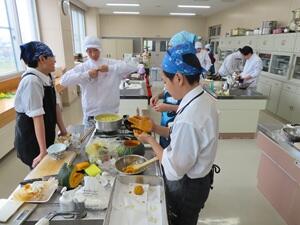 農業の授業で自分たちで栽培し、収穫まで行ったカボチャ(ほっこりうらら)を使用したオリジナルのレシピを考案し、それぞれのグループの色が出るオレンジの色鮮やかな料理が並びました。