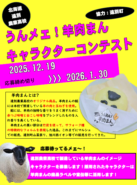 本校の乳肉加工分会が製造している「うんメェ!羊肉まん」のキャラクターコンテストを開催します。