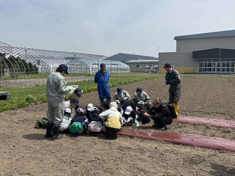 遠別小学校2年生と高校生が一緒にトウモロコシを播種しました。小学生たちは高校生に教えてもらいながら一生懸命播種していました。